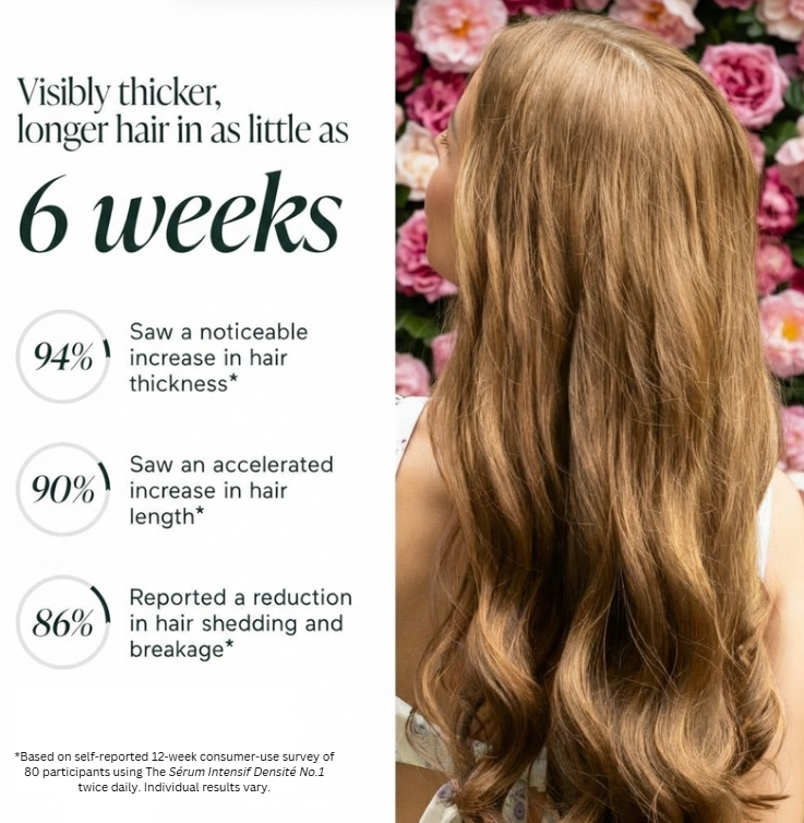 Most women notice reduced shedding between weeks 4–6. Visible density improvement — fuller part, thicker texture — typically appears by month 3. Hair growth operates on a 90-day cycle, so we recommend committing to at least 3 months before assessing results.