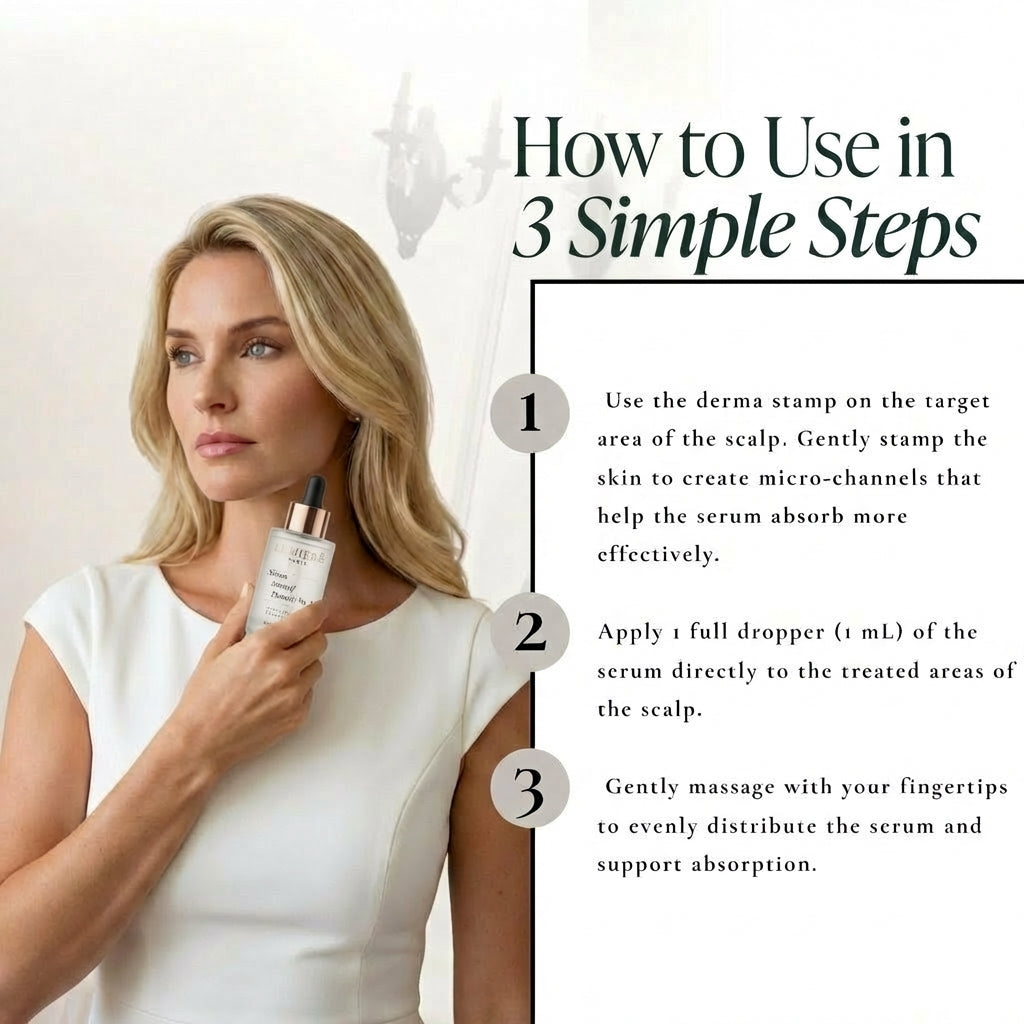 Apply 8–10 drops to dry scalp at crown and parting. Massage in with fingertips. Leave in overnight. Use nightly for minimum 90 days.